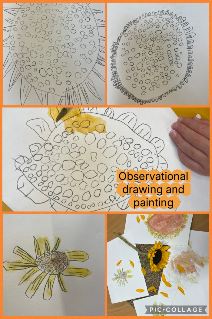 class 2 observational drawing and painting of sunflowers today. Lots of detail and concentration and beautiful artwork. 🌻